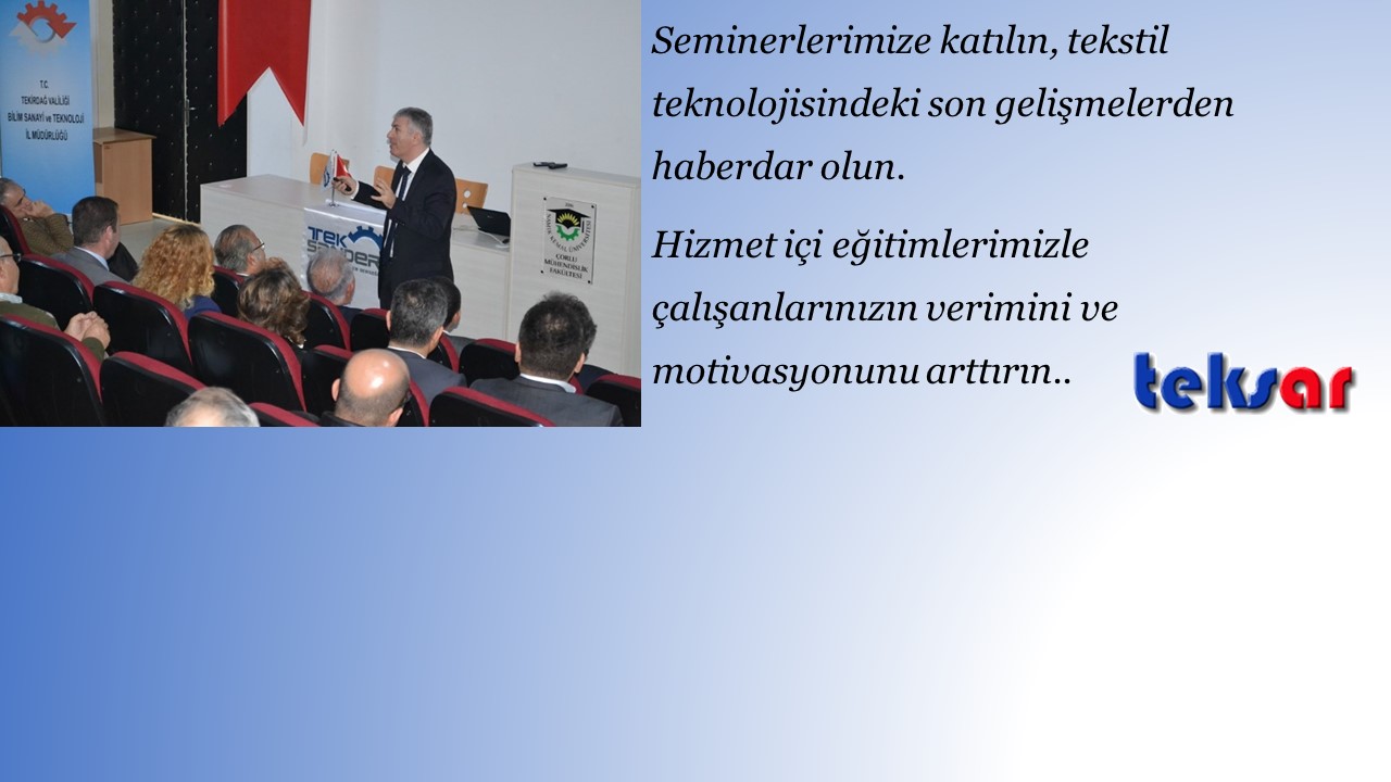 Tekstil firmaları insan kaynağı açığını çoğu zaman farklı alanlardan deneyimsiz çalışanlar ile kapatmaya çalışmaktadırlar. Sürekli sirkülasyon halindeki işgücünü eğitmek ciddi bir sorundur. Öte yandan eğitimsiz ve deneyimsiz pesonelin yol açtığı zarar milyonlarca liraya ulaşabilmektedir. Bu nedenle işyerlerinde sürekli hizmet içi eğitim hayati öneme sahiptir. Teksar olarak işletmelerimize deneyimli öğretim üyelerimizle aşağıdaki alanlarda uygulamalı eğitim hizmeti sunmaktayız: